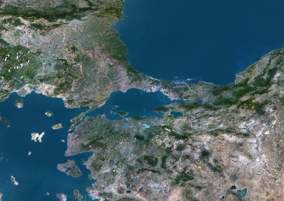 صورة بالأقمار الصناعية لمضيقي البسفور (في الشمال) والدردنيل (في الجنوب) في تركيا