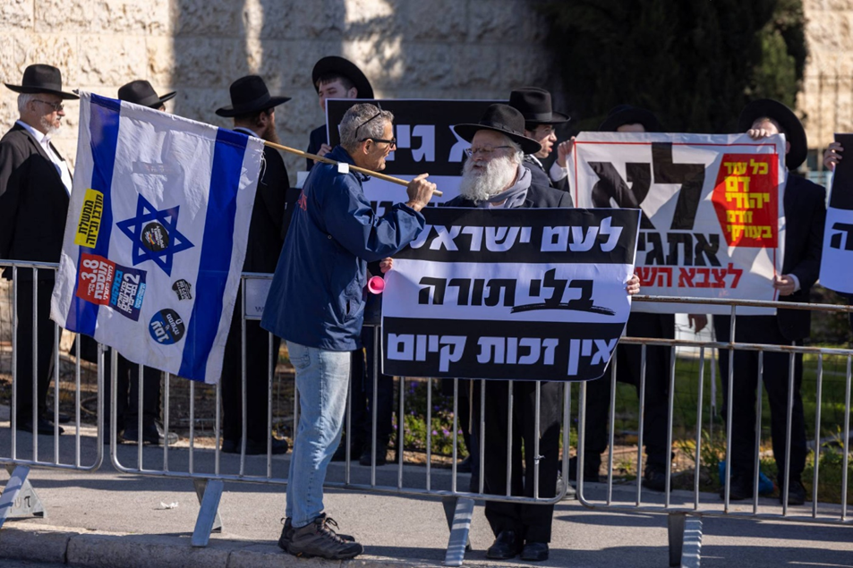 متظاهر إسرائيلي (يسار) يطالب بالمساواة في التجنيد يواجه متديناً يهودياً يدعو إلى إعفاء طلاب المدارس الدينية من الخدمة بالقدس 26 فبراير 2024 (رويترز)