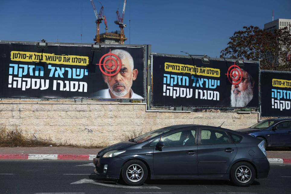 لافتات في القدس تحمل صورة زعيم «حماس» الراحل يحيى السنوار وأخرى لزعيم «حزب الله» الراحل حسن نصر الله (أ.ف.ب)