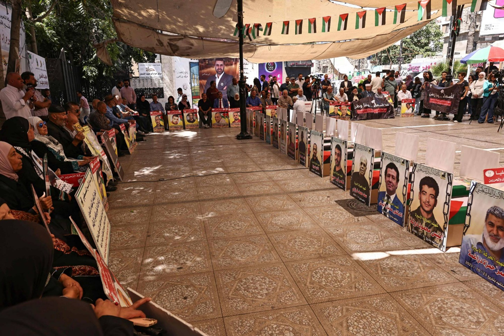 فلسطينيون يشاركون في مظاهرة بمدينة رام الله أغسطس 2024 للمطالبة بالإفراج عن جثامين ذويهم بالسجون الإسرائيلية (أ.ف.ب)