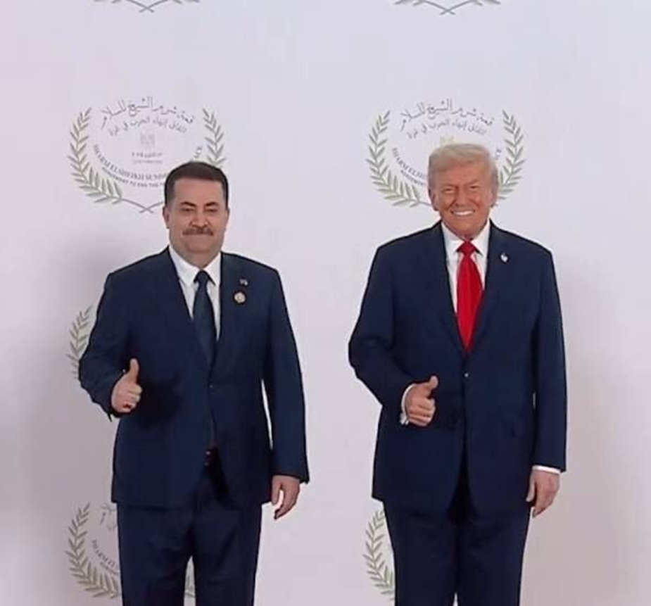 ففي الصورة الأولى، ظهر ترامب والسوداني في قمة شرم الشيخ بشان غزة وهما يبتسمان ويرفعان الإشارة نفسها، بينما بدت أجواء اللقاء البسيط ودّية للغاية.