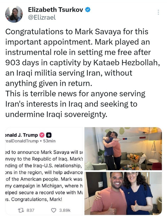 وقالت تسوركوف في منشورها: “مارك سافايا ساعد في التفاوض على إطلاق سراحي دون أن يُقدَّم أي مقابل”، ما أثار موجة من التساؤلات حول الدور الحقيقي الذي أدّاه المبعوث الأمريكي في الملف، وحجم التنسيق الذي جرى بينه وبين أطراف عراقية وأخرى دولية خلال عملية الإفراج.