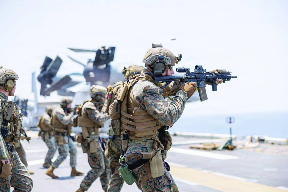 جنود من مشاة البحرية الأميركية خلال تدريبات إطلاق نار على سطح السفينة «يو إس إس تريبولي» في 2 أبريل (سنتكوم)