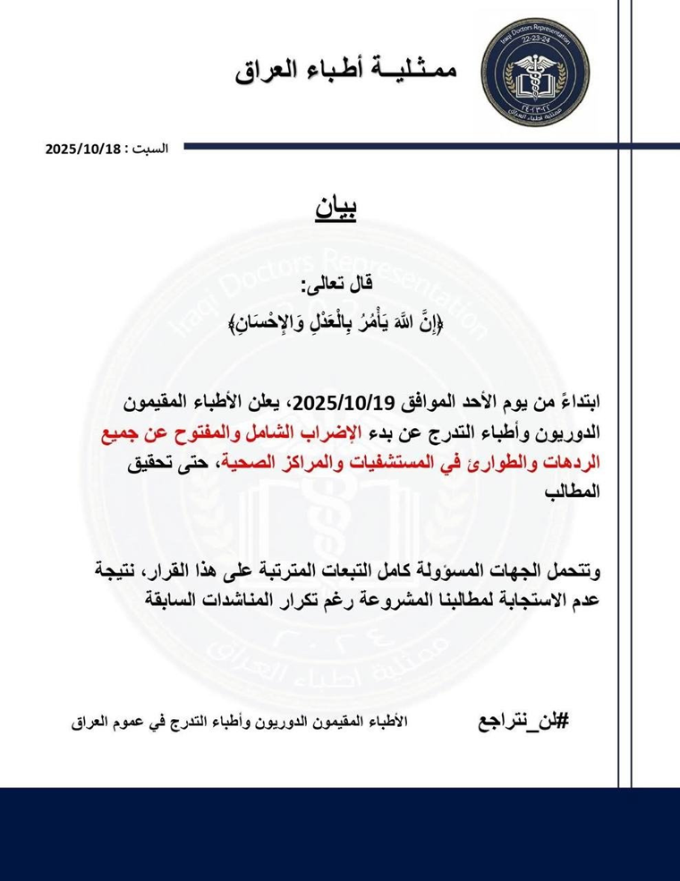 أعلنت ممثلية أطباء العراق، اليوم السبت، عن بدء الأطباء المقيمون الدوريون وأطباء التدرج، الإضراب الشامل والمفتوح عن جميع الردهات والطوارئ في المستشفيات.