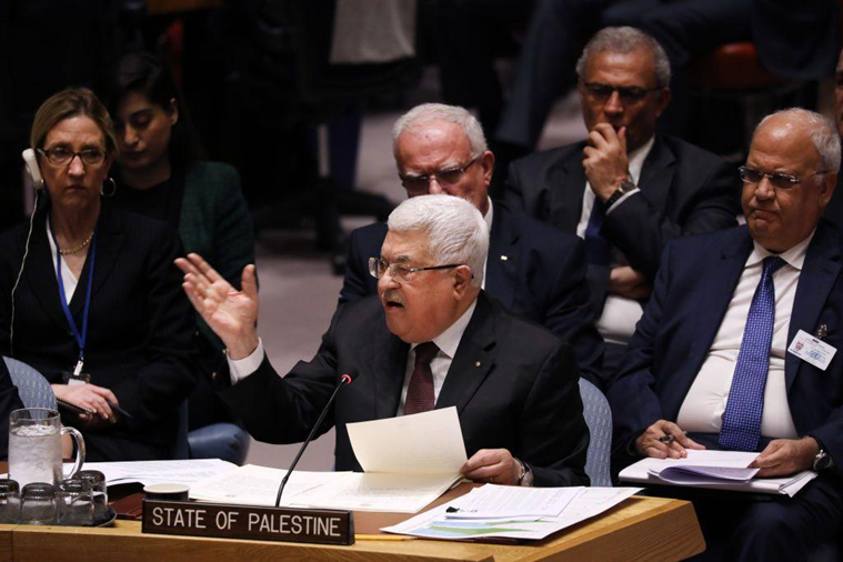 صورة أرشيفية لرئيس السلطة الفلسطينية محمود عبّاس في مجلس الأمن ومعه الوفد الفلسطيني ومن ضمنه صائب عريقات (إلى اليمين)