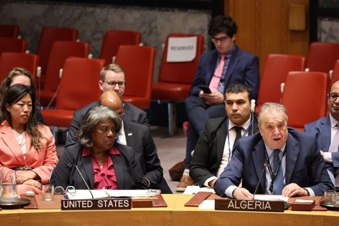 صورة أرشيفية: تُصغي السفيرة ليندا توماس غرينفيلد، ممثلة الولايات المتحدة لدى الأمم المتحدة، بينما يتحدث السفير عمار بن جامع، الممثل الدائم للجمهورية الجزائرية الديمقراطية الشعبية لدى الأمم المتحدة، خلال اجتماع لمجلس الأمن الدولي بشأن الوضع في الشرق الأوسط، بما في ذلك المسألة الفلسطينية، وذلك في مقرّ الأمم المتحدة في 16 أيلول/سبتمبر 2024 بمدينة نيويورك.
