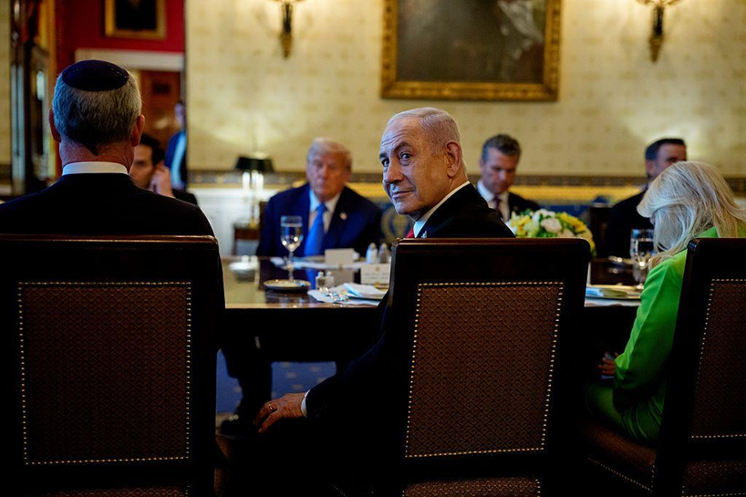 رئيس الوزراء الإسرائيلي بنيامين نتنياهو يلتفت مبتسمًا خلال عشاء رسمي في الغرفة الزرقاء بالبيت الأبيض، بحضور الرئيس الأمريكي دونالد ترامب، ووزير الخارجية ماركو روبيو، ووزير الدفاع بيت هيغسث، في 7 يوليو/تموز 2025، واشنطن العاصمة.