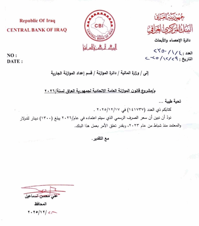 خاطب البنك المركزي العراقي، وزارة المالية بشأن سعر الصرف الرسمي للدولار الذي سيُعتمد في مشروع قانون الموازنة العامة الاتحادية لعام 2026.