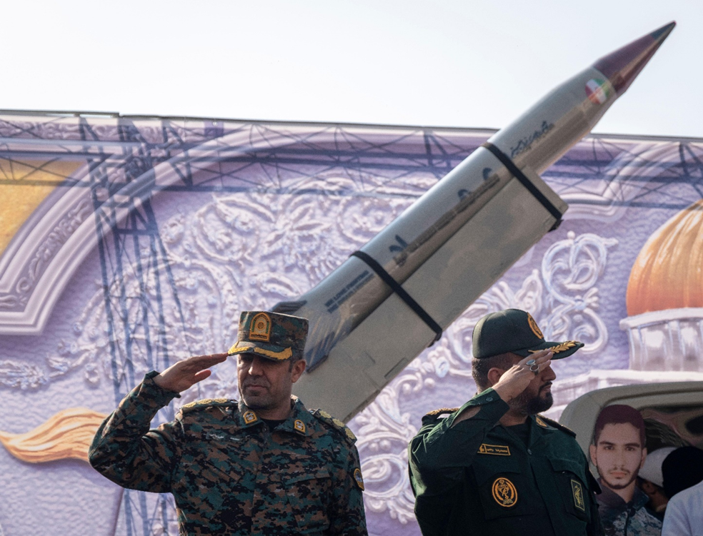 قائدان عسكريان إيرانيان يؤديان التحية العسكرية وهما يقفان أمام نموذج مصغر لصاروخ خلال استعراض عسكري نظمه الحرس الثوري في طهران في 10 يناير/كانون الثاني 2025.