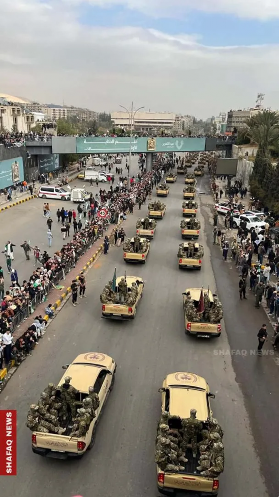 وحضر الرئيس أحمد الشرع، العرض العسكري على أوتوستراد المزة، برفقة وزراء الخارجية والمغتربين أسعد الشيباني، والدفاع مرهف أبو قصرة، والداخلية أنس خطاب، إضافة إلى عدد من كبار مسؤولي الدولة.