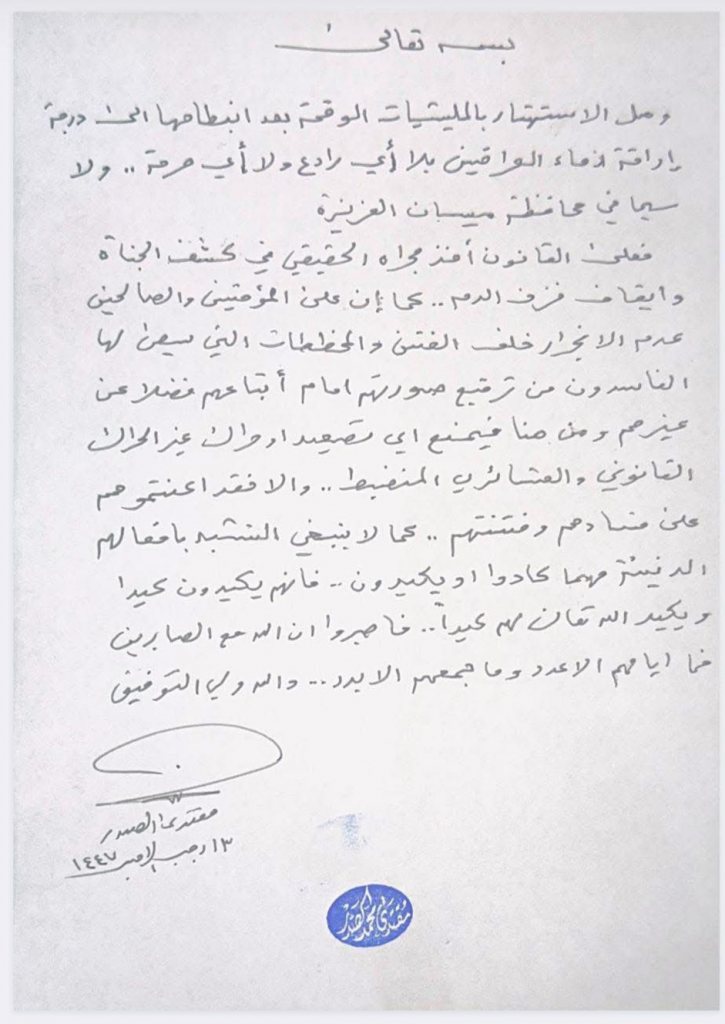 السيد الصدر يصدر بيانا بشأن ميسان: وصل الاستهتار بالمليشيات الوقحة إراقة دماء العراقيين