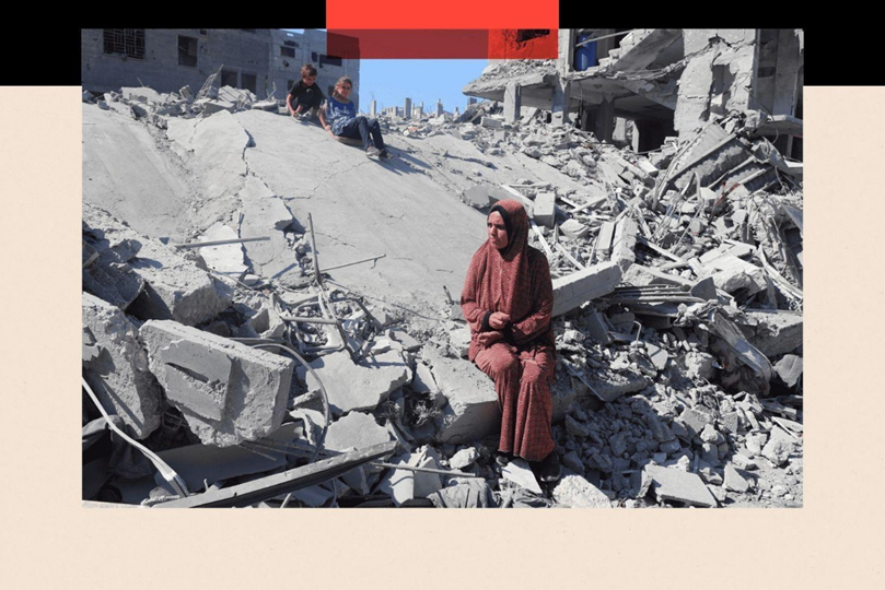 سيدة وطفل وطفلة يجلسون على ركام أحد المباني المدمرة في قطاع غزة.Reuters