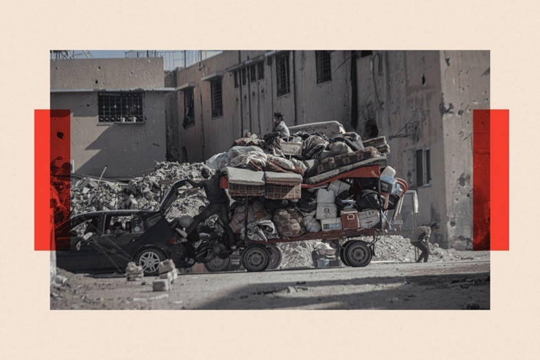 تقوم الجرافات بإزالة الطرق، وتجمع حطام الحرب في الشاحنات المنتظرة. جبال من الأنقاض والمعادن الملتوية على كلا الجانبين، بقايا جثث لأشخاص كانوا يعجّون بالحياة ذات يوم.