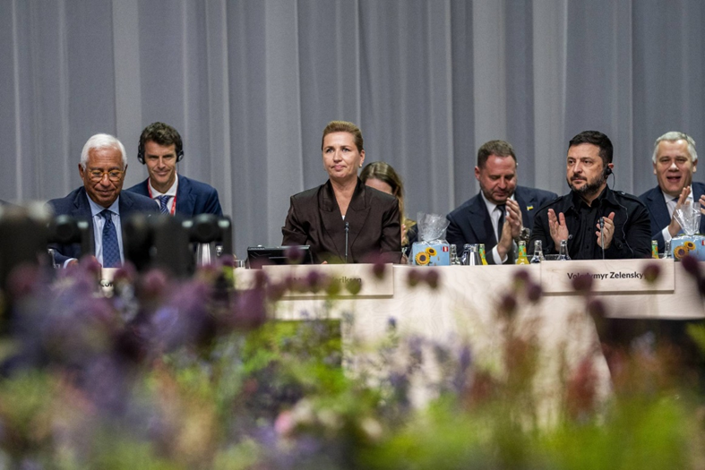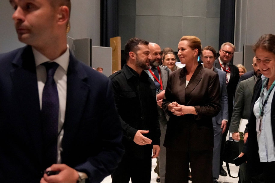 زيلينسكي مع رئيسة وزراء الدنمارك محاطة بمجموعة من قادة المجموعة السياسية (أ.ف.ب)