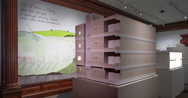وبحسب التقرير، فإن “مصممي المعرض اعتمدوا على دمج المقابلات المطولة ومنهجيات المعلومات مفتوحة المصدر (OSINT)، مثل دراسة صور الأقمار الصناعية، من أجل إعادة تشكيل المظهر الخارجي للنماذج بدقة، سواء فيما يتعلق بالتصميمات الداخلية أو الهيكل العام للمنازل”، لافتاً إلى أن “المقتنيات الموجودة داخل المنازل الأصلية، صورت من خلال رسومات منى الجلبي على قماش حريري شفاف“.