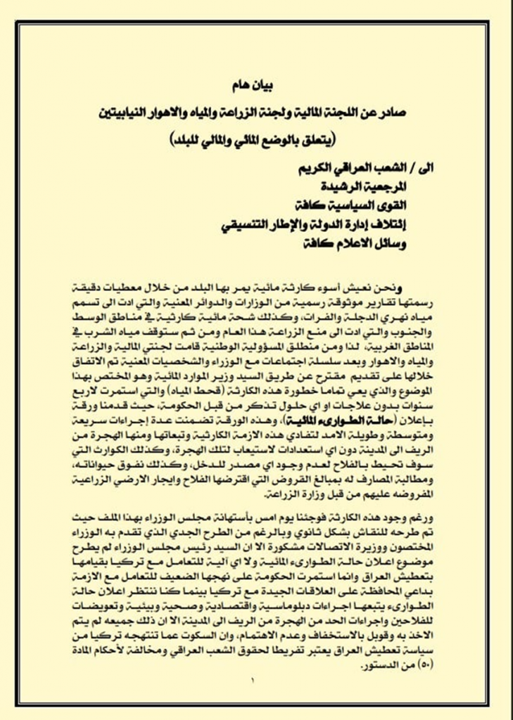 أصدرت اللجنتين المالية والزراعة النيابيتين، اليوم الأربعاء، بيانا يحذر من ازمة قد تعصف بالعراقيين تخص المياه.