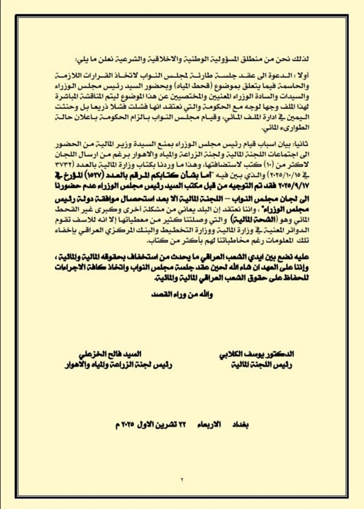 –الدعوة الى عقد جلسة طارئة لمجلس النواب لاتخاذ القرارات اللازمة والحاسمة فيما يتعلق بموضوع (قحط المياه وبحضور رئيس مجلس الوزراء والوزراء المعنيين والمختصيين عن هذا الموضوع ليتم المناقشة المباشرة لهذا الملف وجها لوجه مع الحكومة والتي نعتقد انها فشلت فشلا ذريعا بل وحنثت اليمين في ادارة الملف المائي، وقيام مجلـس النـواب بـالزام الحكومة باعلان حالة الطوارىء المائي.