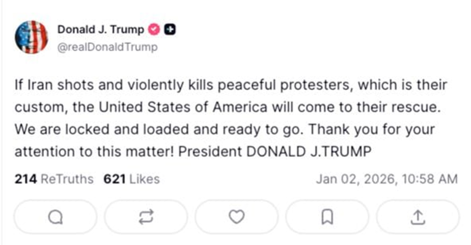 وقال ترامب في تدوينة على منصة (X) “إذا أطلقت إيران النار على المتظاهرين السلميين وقتلتهم بعنف، كما جرت عادتها، فإن الولايات المتحدة الأمريكية ستتدخل لنجدتهم“.