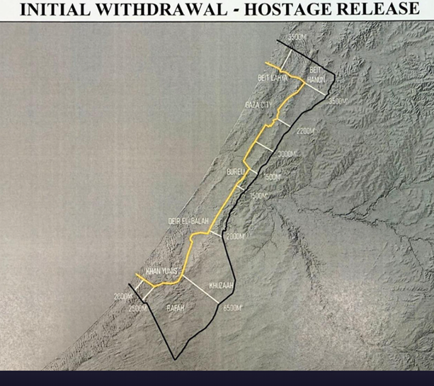 وأضاف أنه عندما تؤكد حماس موافقتها (على خط الانسحاب هذا)، “سيدخل وقف إطلاق النار حيز التنفيذ فوراً، وسيبدأ تبادل الرهائن والسجناء، وسنهيّئ الظروف للمرحلة التالية من الانسحاب”، مرفقاً ذلك بخريطة تُظهر خط انسحاب باللون الأصفر داخل قطاع غزة.