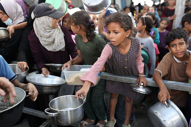 فلسطينيون من بينهم أطفال، يصارعون من أجل الحصول على وجبة طعام، توزعها منظمة خيرية في مخيم النصيرات للاجئين في مدينة غزة.