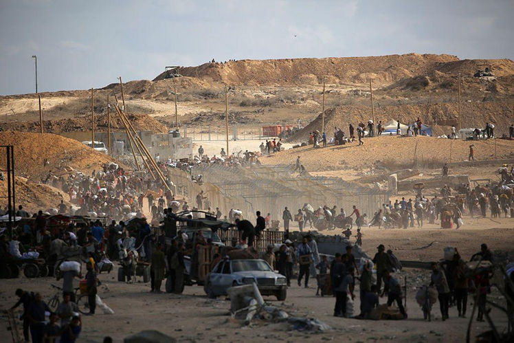 فلسطينيون يحملون أكياس طعام، أثناء عودتهم من نقطة توزيع طعام تديرها مؤسسة غزة الإنسانية المدعومة من الولايات المتحدة وإسرائيل، بالقرب من ممر نتساريم في وسط قطاع غزة في 5 أكتوبر 2025.
