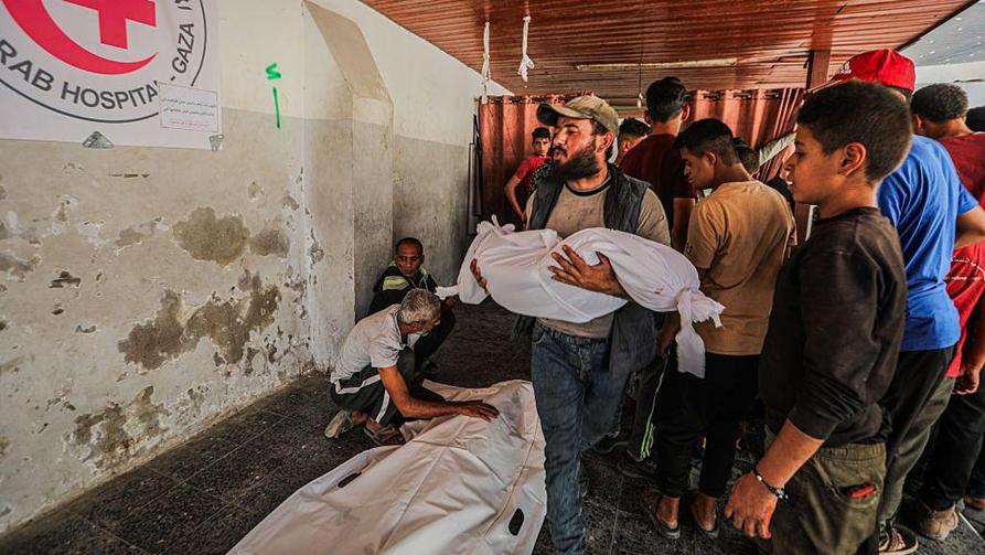 رجل من غزة يحمل جثمان شخص من عائلته قُتل بنيران إسرائيلية وسط جموع من الناس.