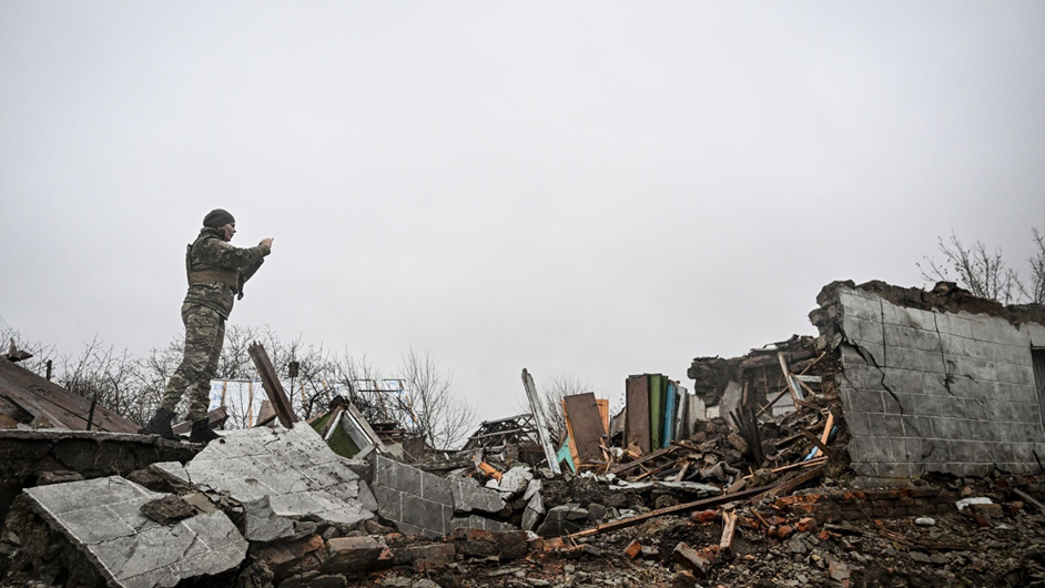 جندية تلتقط صورة لمنزل دمره قصف روسي في قرية فوزدفيزهيفكا الواقعة على خط المواجهة في مقاطعة بولوهي، منطقة زابوريزهيا، أوكرانيا، في 19 نوفمبر/تشرين الثاني 2025.