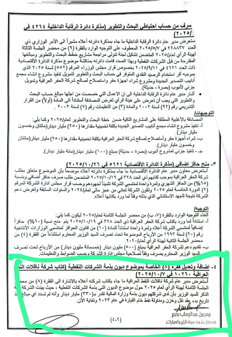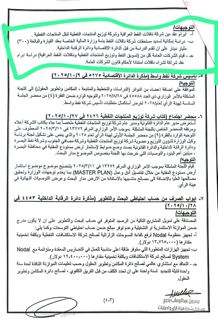 واظهرت وثائق جلسة هيئة الرأي في وزارة النفط صدور توجيهات بابرام عقد بين شركة الناقلات النفطية وشركة توزيع المنتجات النفطية، ودراسة إمكانية تسديد مستحقات شركة النقالات النفطية بذمة وزارة المالية والمتعلقة بنقل مشتقات حقل القيارة والبالغة 300 مليار دينار.