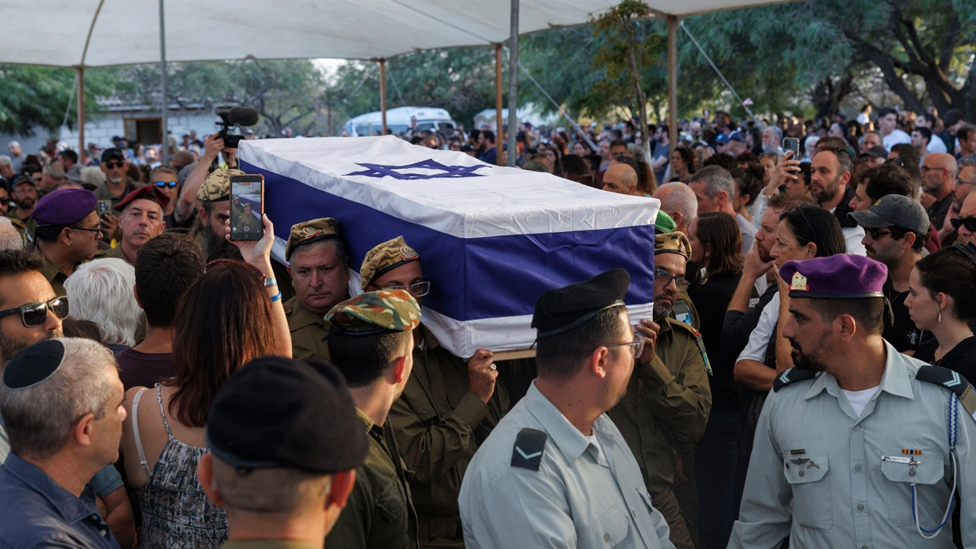 جنود إسرائيليون يحملون نعشاً لضابط إسرائيلي كان محتجزاً لدى حركة حماس