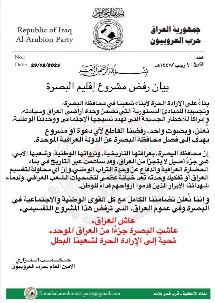جدد الأمين العام لحزب العروبيون، حكمت النزاوي، موقفه الوطني الرافض وبشكل قاطع لكل الدعوات والمشاريع المشبوهة التي تسعى إلى استحداث إقليم البصرة، معتبرًا إياها محاولات خطيرة لضرب وحدة العراق وتمزيق نسيجه الوطني. وأكد النزاوي، في بيان صدر اليوم، أن البصرة كانت وستبقى جزءًا لا يتجزأ من العراق الواحد الموحد، مشددًا على وقوف الحزب الكامل إلى جانب القوى الوطنية والاجتماعية في البصرة وعموم البلاد في مواجهة أي مخطط تقسيمي يستهدف السيادة الوطنية. وفيما يلي نص البيان: