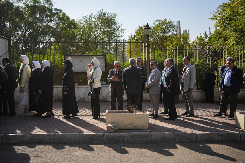 طوابير الناخبين خارج المكتبة الوطنية في العاصمة دمشق حيث مراكز الاقتراع (د.ب.أ)