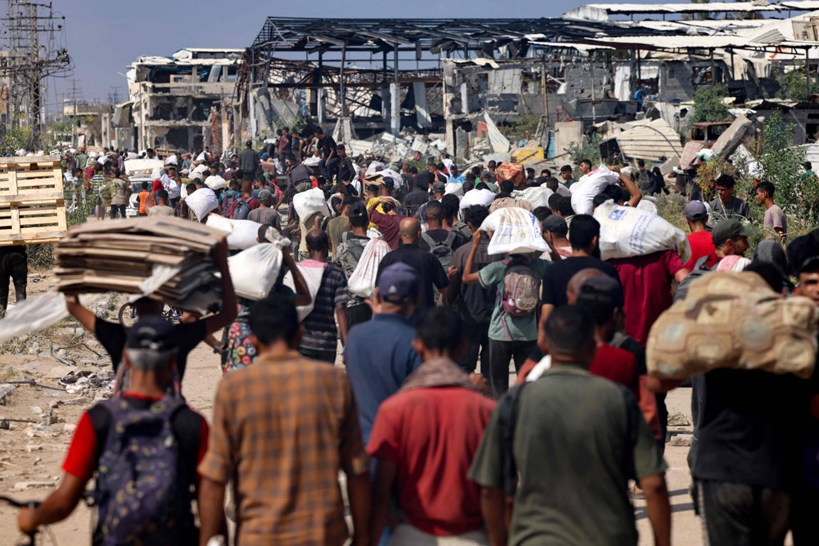 نازحون يحملون أجولة طحين عند مركز توزيع في نتساريم بوسط قطاع غزة (أ.ف.ب)