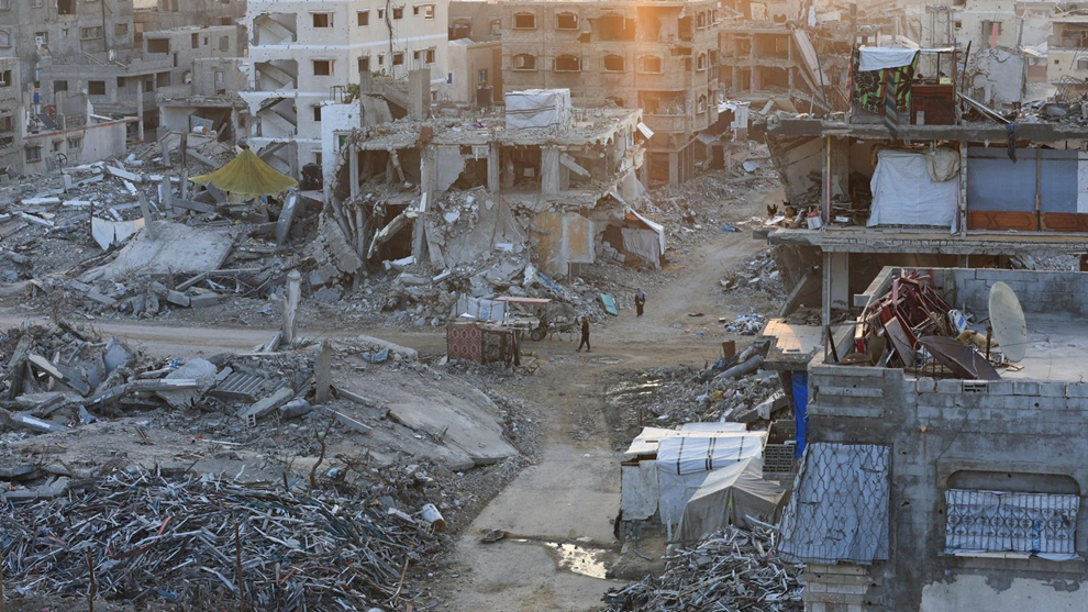 فلسطينيون يسيرون بين أكوام الأنقاض والمباني المتضررة في مدينة غزة، 24 نوفمبر/تشرين الثاني 2025.