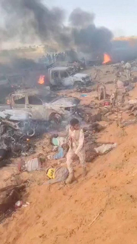 أفراد من «قوات الدعم السريع» يسيرون وسط جثث أشخاص عُزّل ومركبات محترقة في أثناء هجوم بالقرب من الفاشر (رويترز)