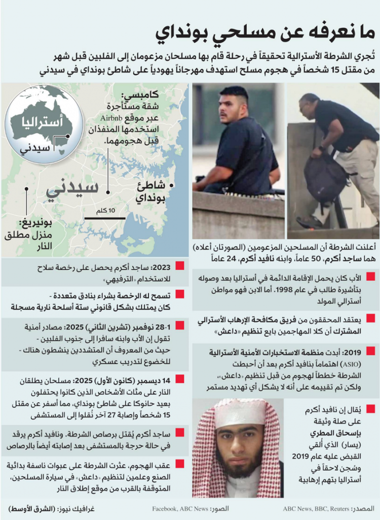 وكان مكتب الهجرة في الفلبين قد ذكر، الثلاثاء، أن المسلحَين المتهمَين بتنفيذ إطلاق النار الجماعي بشاطئ بونداي سافرا إلى الفلبين في أول نوفمبر على متن الرحلة “بي آر 212” التابعة لـ”الخطوط الجوية الفلبينية”، من سيدني إلى مانيلا، ومنها إلى مدينة دافاو.