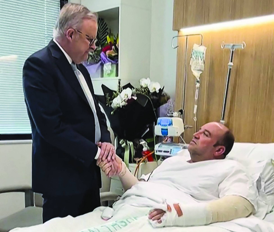 لقطة من فيديو على حساب رئيس الوزراء الأسترالي أنتوني ألبانيز على «إكس» تُظهره وهو يلتقي السوري أحمد الأحمد الذي انتزع سلاح أحد المهاجمين خلال هجوم شاطئ بونداي في مستشفى بسيدني (أ.ف.ب)