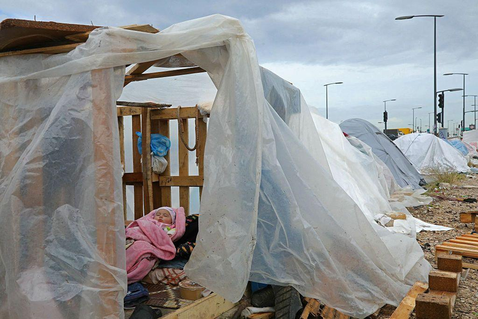 طفل نازح ينام داخل خيمة في موقف سيارات على الواجهة البحرية في بيروت، في 22 مارس/آذار 2026.