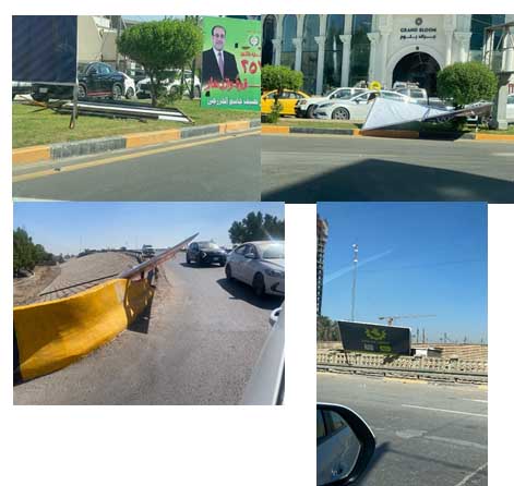 وقال مراسل السومرية نيوز ان “عدد من لوحات الدعايات الانتخابية سقطت في الشوارع والجزرات الوسطية نتيجة هبوب رياح بسيطة، ما أدى الى عرقلة المرور في بعض الشوارع“.