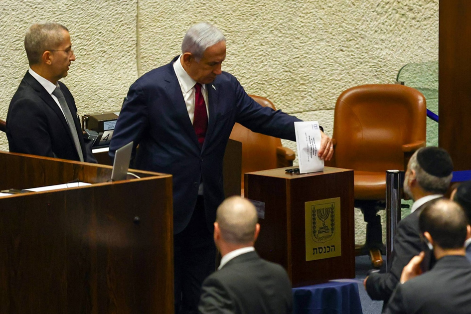 نتنياهو يدلي بصوته خلال التصويت لانتخاب لجنة تعيين القضاء في الكنيست – يونيو 2023 (رويترز)