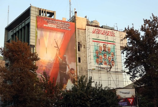لافتة تحمل صورة قادة إيرانيين قُتلوا في الحرب الأخيرة وأخرى مناهضة لإسرائيل فوق مركز إعلامي معني بفلسطين وسط طهران (إ.ب.أ)