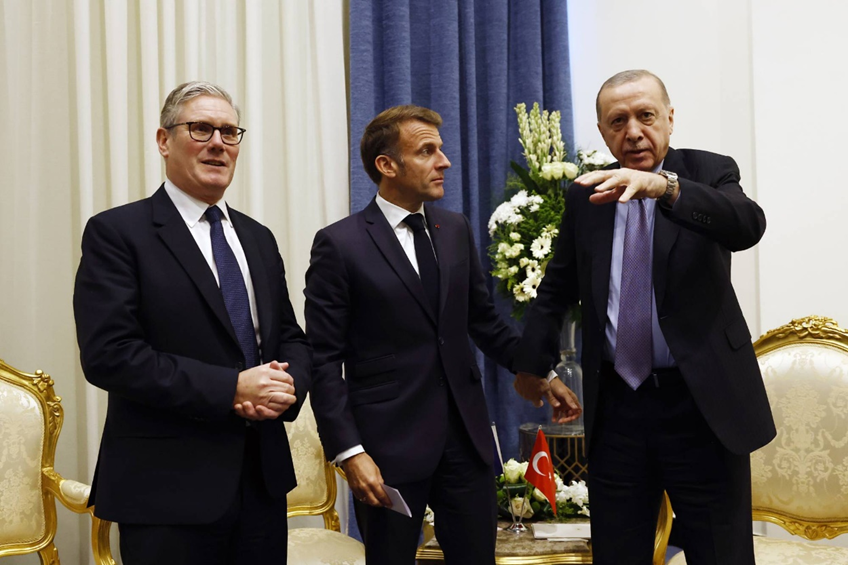 الرئيس الفرنسي إيمانويل ماكرون محاطاً برئيس الحكومة البريطانية كير ستارمر والرئيس التركي رجب طيب إردوغان لدى مشاركتهم في المؤتمر الدولي بشرم الشيخ بشأن غزة الاثنين (أ.ب)