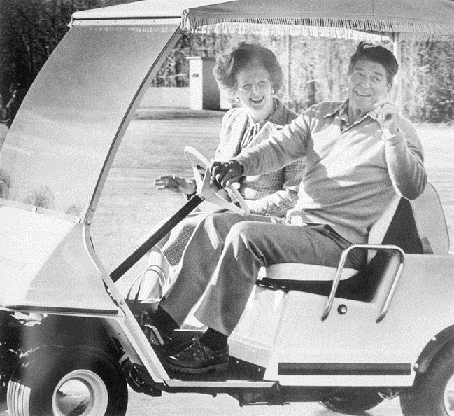 ريغان وتاتشر يلوحان للمصورين وهما في عربة الغولف الخاصة بالرئيس الأمريكي في صورة تعود لديسمبر من عام 1984