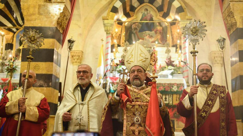 المطران بطرس مراياتي يترأس قداس صباح عيد الميلاد في الكنيسة الأرمنية الكاثوليكية في مدينة حلب شمال سوريا، في 25 ديسمبر/كانون الأول 2023.