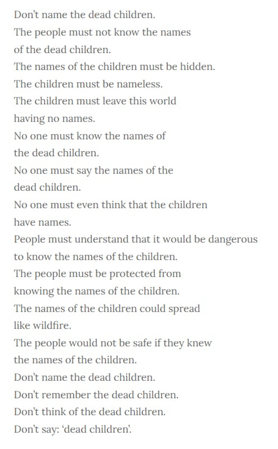 أضاف:”إن أوامر روزن القاسية تُحدّق في أرواحنا مباشرة، وتُجبرنا على مواجهة قسوة محو طفل، محو اسمه وذكراه وحياته“.