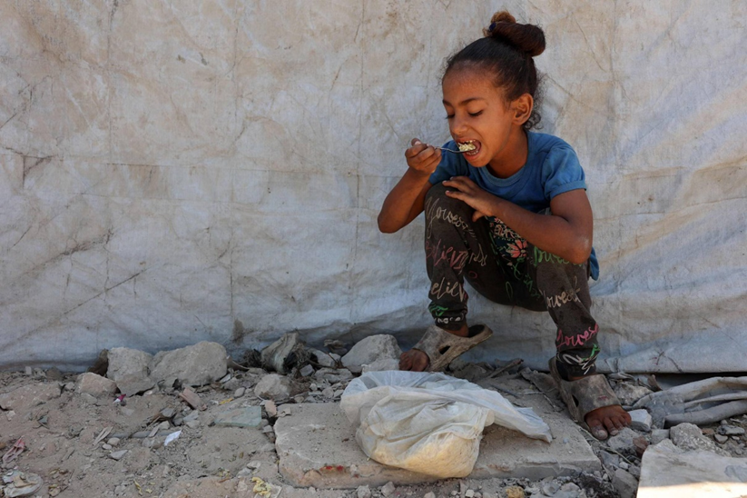فتاة فلسطينية تأكل أرزاً مطبوخاً حصلت عليه من مطبخ خيري في مدينة غزة السبت (أ.ف.ب)