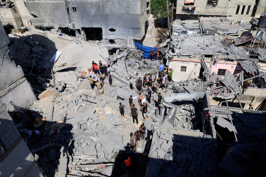 فلسطينيون يعاينون مكاناً استهدفه القصف الإسرائيلي بدير البلح وسط قطاع غزة السبت (رويترز)