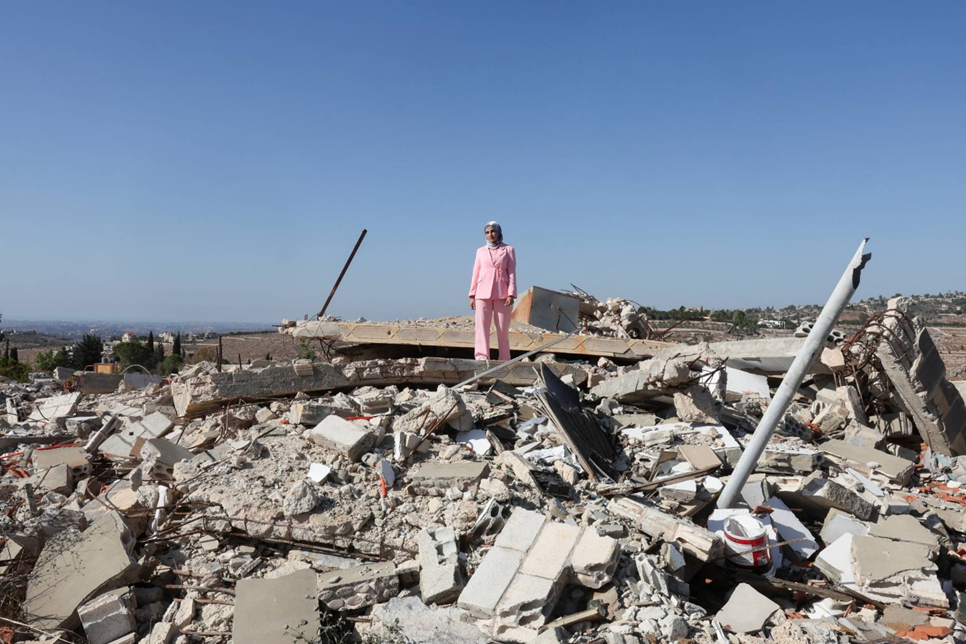 عضو المجلس البلدي في بلدة حولا بديعة سليمان تقف على أنقاض منزلها المدمر جنوب لبنان (رويترز)