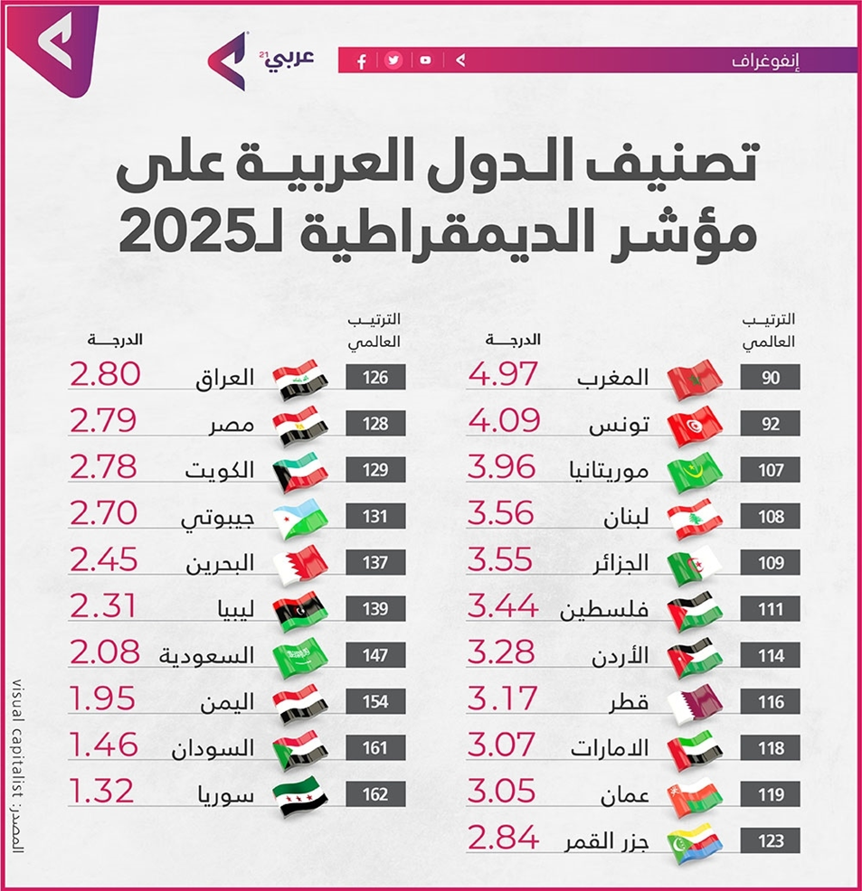 كشف مؤشر الديمقراطية لعام 2025 الصادر عن “visual capitalist”، عن تباين ملحوظ في درجات المسار الديمقراطي للدول العربية، في وقت تواصل فيه الدول الأوروبية هيمنتها على المراكز العشرة الأولى عالمياً.