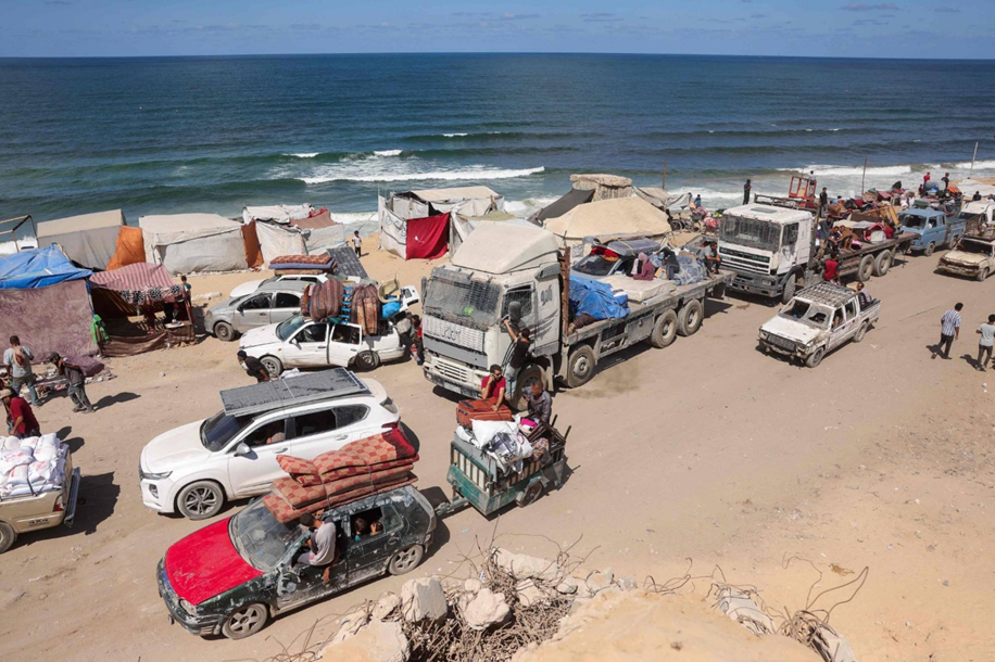 نازحون من غزة بأمتعتهم على طريق ساحلي شمال غربي مخيم النصيرات خلال اتجاههم جنوباً يوم الأربعاء (أ.ف.ب)