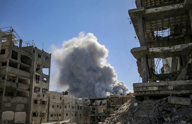 الدخان يتصاعد بعد هجوم إسرائيلي بمدينة غزة يوم الأربعاء (أ.ب)
